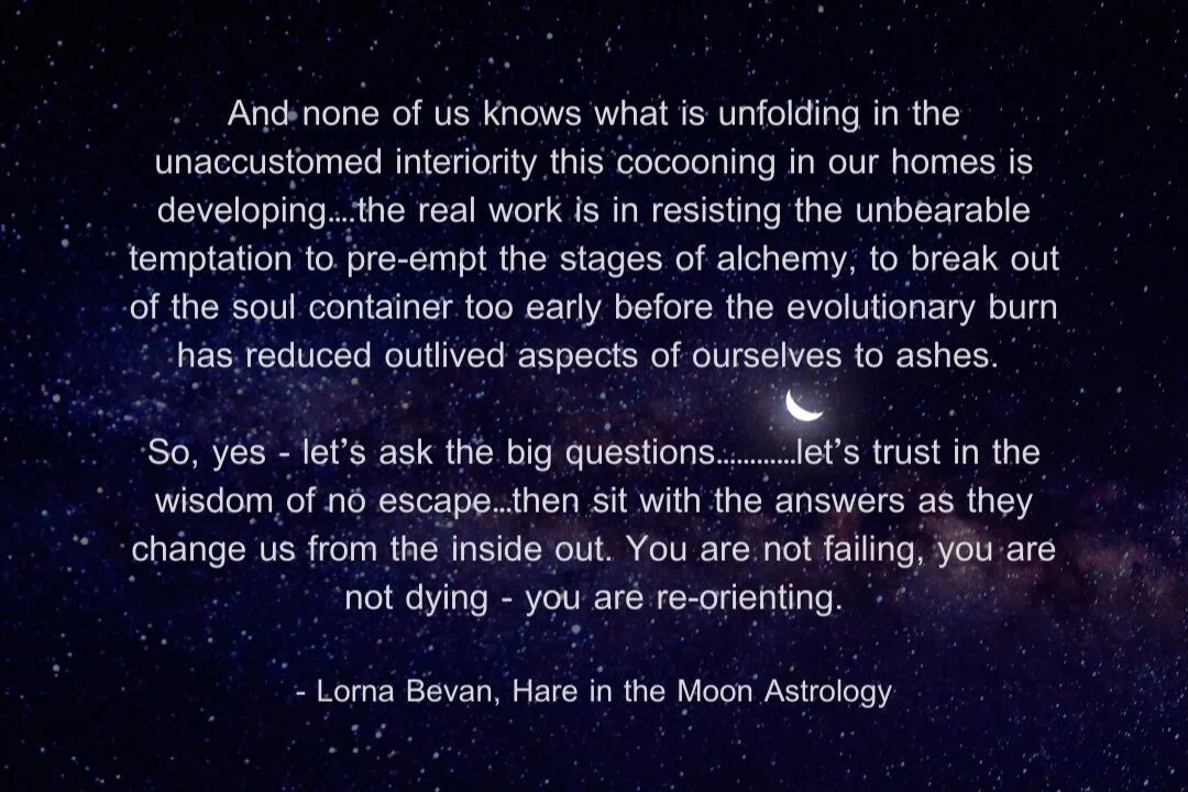 Many of us seem have to hit the point this week of being really, truly, over it. Feeling antsy, irritated, ready to break out. We have been conditioned to expect rapid delivery, easy bake answers, in-the-moment solutions. What we are experiencing is the beginning of a significant transformative period. This is not a microwave meal, this is a slower-cooker recipe. We are living through an alchemical process, a turning from one state of being into something entirely new.